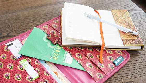 (家族皆の診察予約に欠かせないソレイアードの母子手帳入れ。2人分の母子手帳に家族の診察券がきっちり収まる収納力に大満足!)