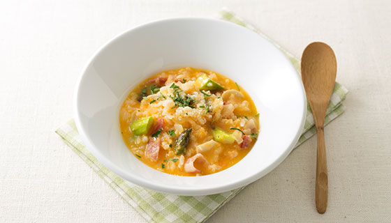 ①ごはんはざるに入れ、さっと洗う。ベーコンは1.5㎝幅に切る。玉ねぎはみじん切り、にんじんはすりおろす。エリンギは縦半分に切り、2~3mm幅に切る。アスパラガスは乱切りにする。