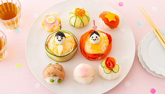 ・丸く握ったすし1個には、生ハム1枚とリボン状に削ったきゅうり2枚を巻く。もう1個には、残りのスモークサーモンを巻く。うずら卵にのりやケチャップで、お殿様とおひな様の顔を作ってのせ、それぞれピックで刺す。型または包丁でスライスチーズを切り、笏(しゃく)や扇(おうぎ)として飾る。