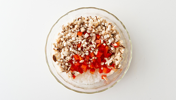 耐熱容器に、ごはん、パプリカ、しいたけの順に入れてふんわりラップをし、600W の電子レンジで1分30秒〜2分加熱する。