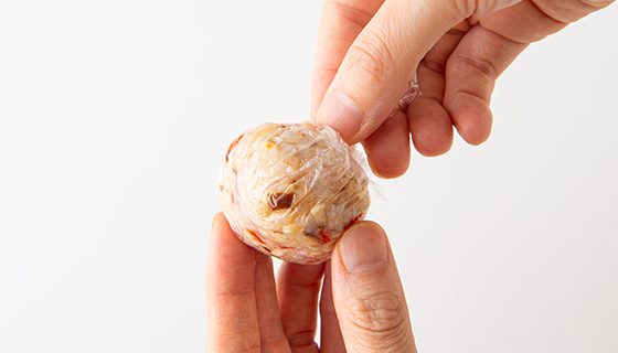 しょうゆ、みりんを加えてしゃもじで混ぜ、4等分にしてラップで丸く握る。