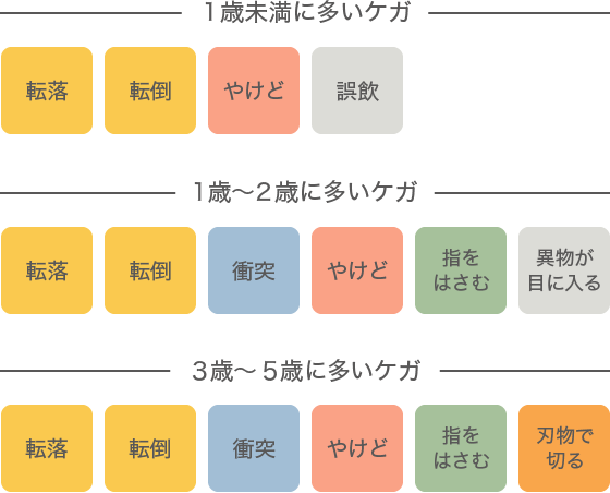 子どものケガは成長につれて変わってきます。まずは年齢別に多いケガの危険を知り、成長の段階ごとにチェックしておきましょう。
