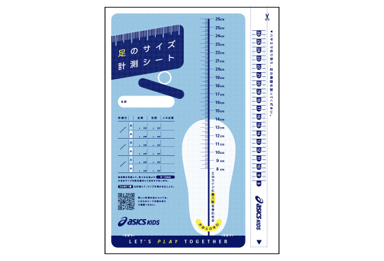2. 子どもの足のサイズを計測・登録します。このとき、自宅にあるメジャーや定規を使って計測してもいいのですが、「ASICS STEPNOTE」のサイト内から「足のサイズ計測シート」をダウンロードし、印刷すれば、より手軽に計測できます。サイトにある測り方のポイントを読みながら、両足の足長(かかとからつま先まで)、足囲(親指と小指のつけ根の張り出した部分の周囲)を測定しましょう。