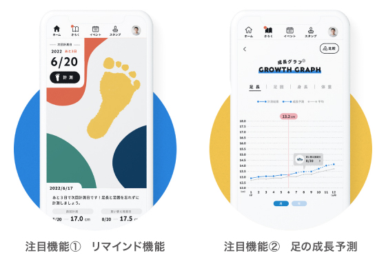 独自のデータをもとに、足の成長を予測。現在の足の大きさと1年後の予測を比較したり、過去・現在・未来の成長をさまざまなグラフで確認できたりする機能です。